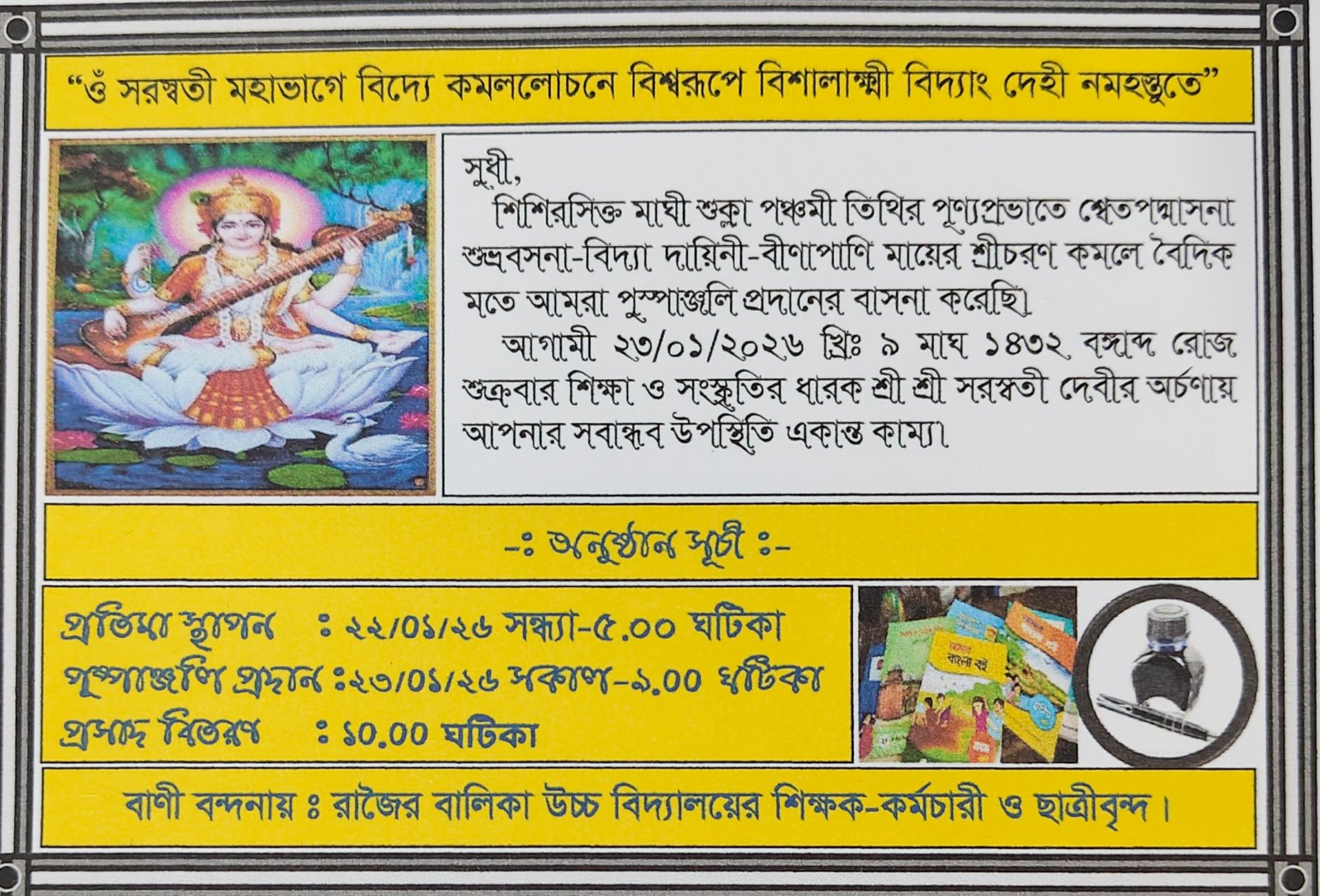 আগামী ২৩/০১/২০২৬খ্রিঃ ৯ মাঘ ১৪৩২ বঙ্গাব্দ রোজ শুক্রবার শিক্ষা ও সংস্কৃতির ধারক শ্রী শ্রী সরস্বতী দেবীর অর্চণায় আপনার সবান্ধব উপস্থিতি একান্ত কাম্য।